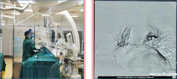 考虑患者有再次大咯血风险,呼吸与危重症医学科介入团队紧急联系介入室,为患者进行了支气管动脉造影及栓塞术,术中发现双侧支气管动脉均有迂曲扩张,依次给与PVC颗粒栓塞,术程顺利。