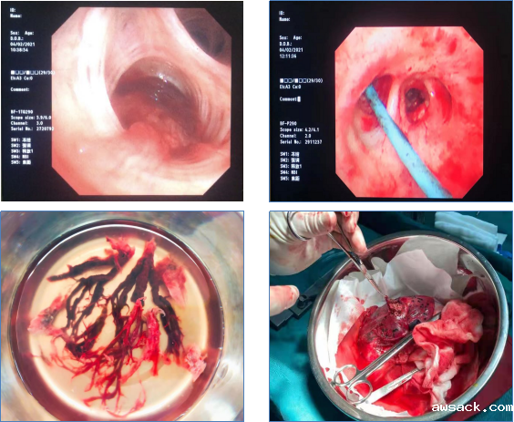 2月3日,我院收治了一名因反复咯血6天,紧急入院的患者,入院后再发大量咯血(约600ml),色泽鲜红,同时出现氧饱和度下降,最低至60%左右,伴意识模糊,考虑大咯血窒息。医护人员立即为患者行经鼻气管插管行机械辅助通气。插管后,见双侧主支气管腔内大量血性液体涌出,反复予以支气管镜吸引后,明确血液来源主要为肺右中下叶,且右中间支气管腔内条状血性分泌物部分阻塞。经冰盐水、药物止血,但效果不佳,氧饱和度持续降低,至20%左右,伴心率下降。患者命悬一线,其主管医师蒲波当机立断,用取石球囊在支气管镜引导下通过气管导管内植入右侧中间支气管,封堵右中间支气管,保持左侧支气管及右上叶支气管通畅。封堵成功,患者氧饱和度逐渐上升至90%,为患者的后续治疗赢得时间。