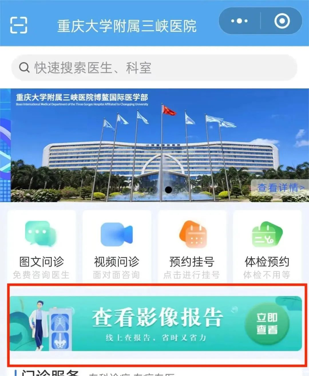 一、关注“必威登录入口平台官网”微信公众号,选择“互联网医院”,点击“查看影像报告”